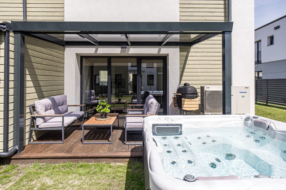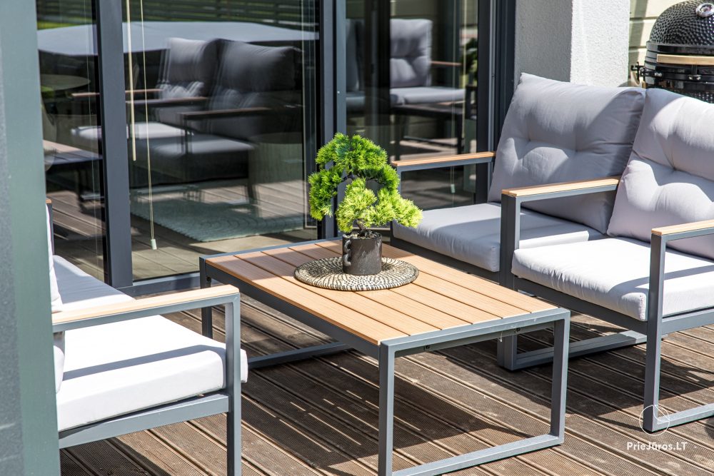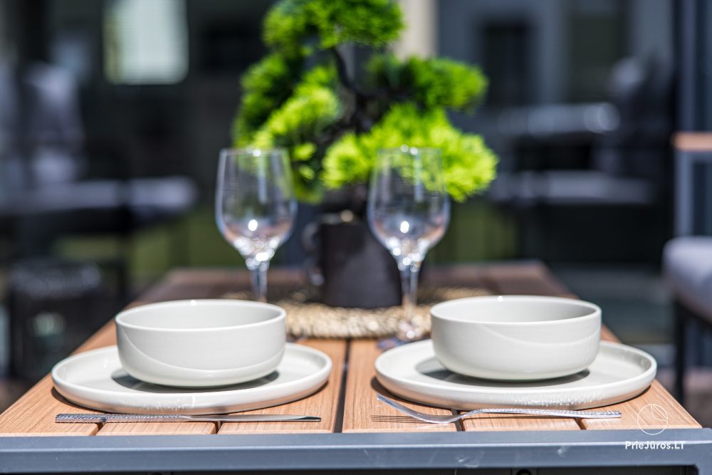 Spacious, bright and stylish apartments for relaxation. The apartments are fully equipped for longer stays, they have everything you might need for a vacation. The biggest advantage is the terrace with outdoor furniture and a heated swimming pool in the block.