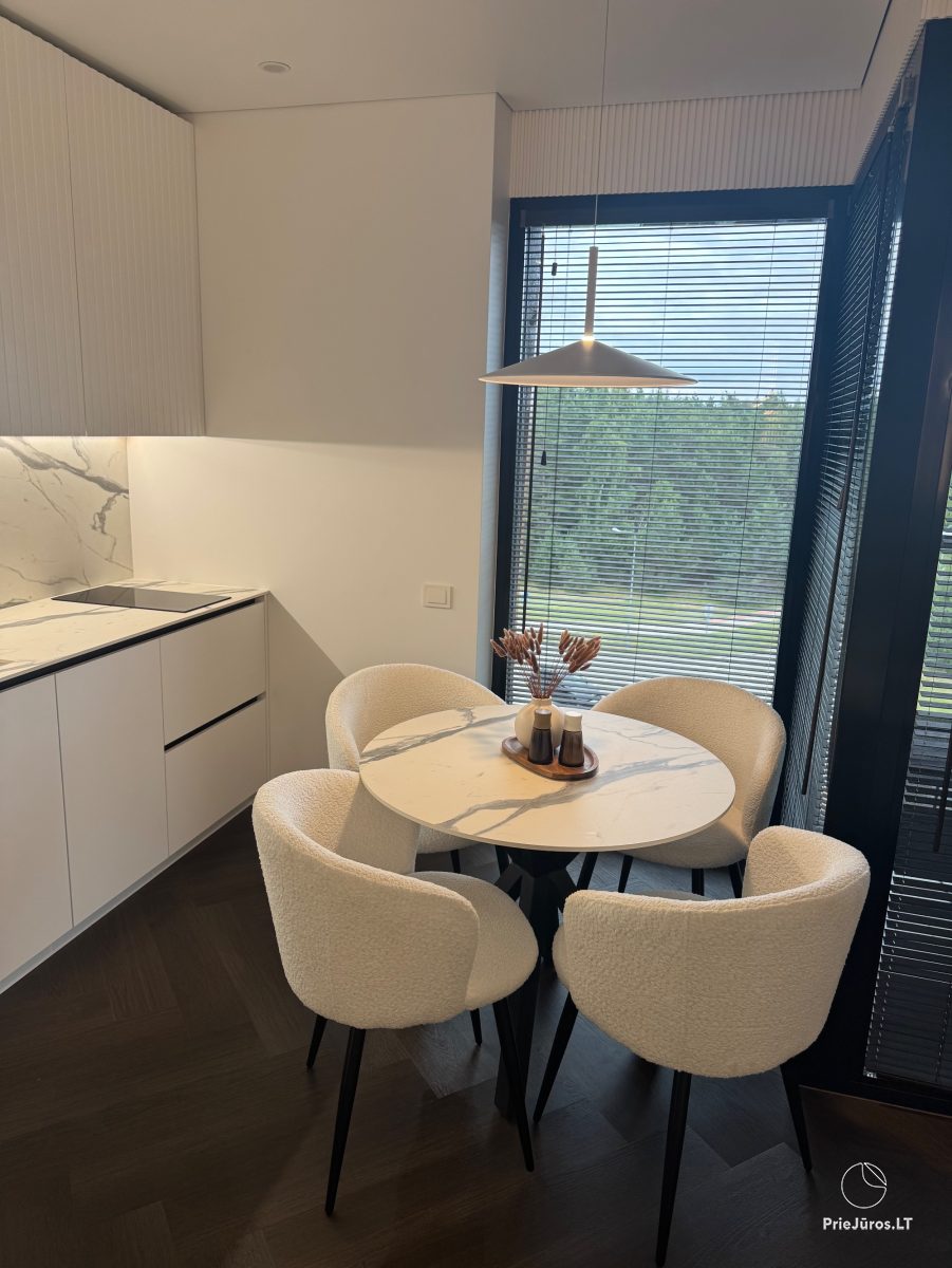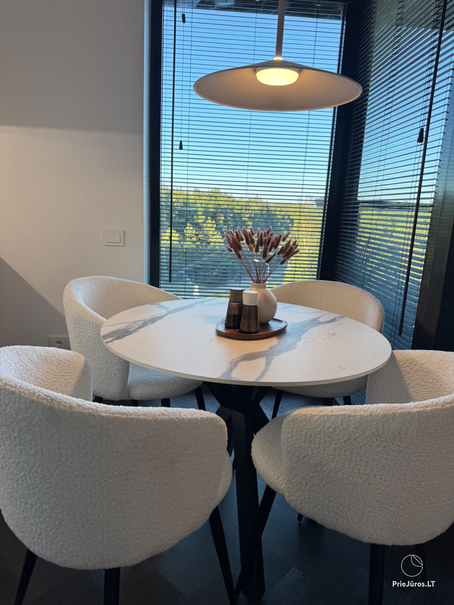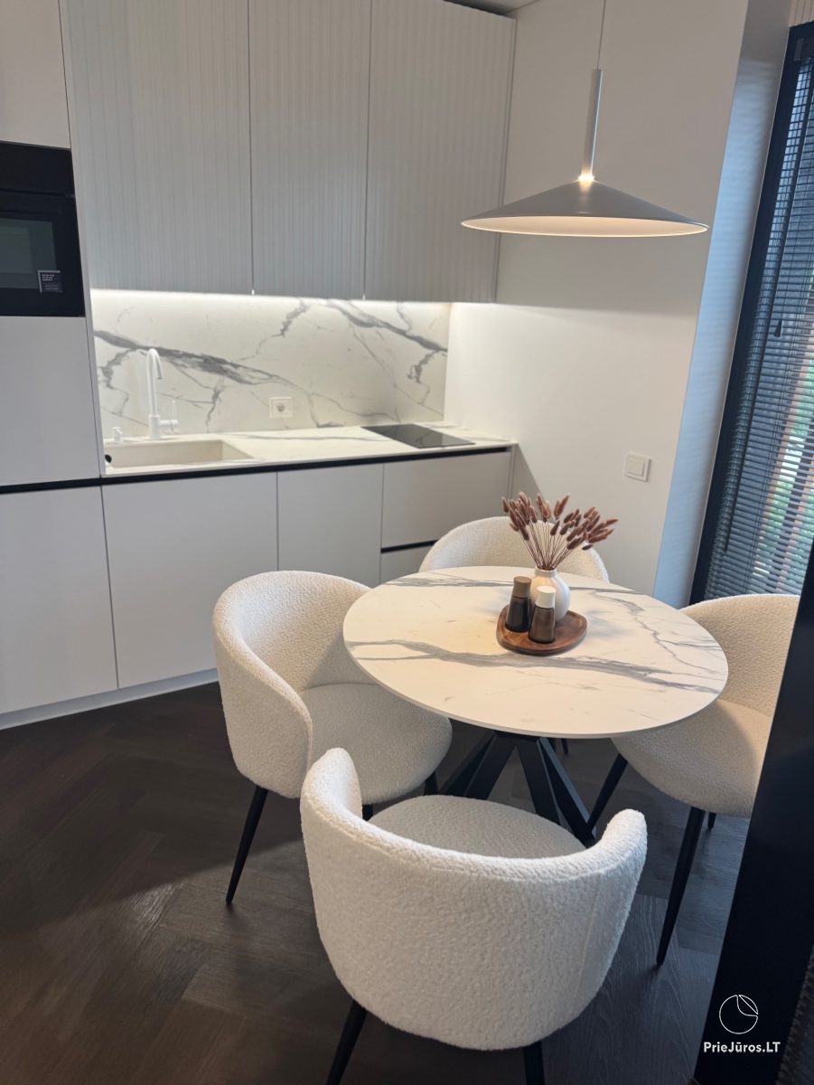 Stylish, comfortable, practical, bright - these are the words we can use to describe these brand new apartments, furnished with love, with every detail considered. Located in the Vanagupės quarter, just 600 meters from the sea on foot, along well-maintained paths through a pine forest. The apartments border Vytautas Street, and you can easily reach the city center by public transport, car, bicycle, scooter or on foot.