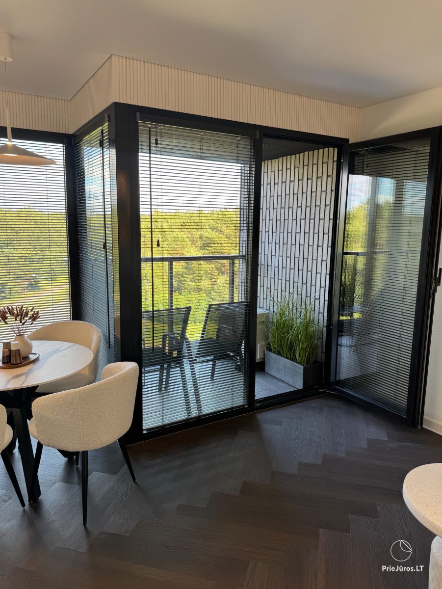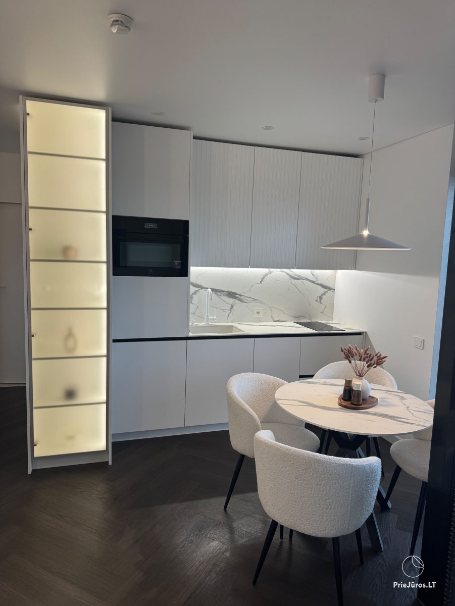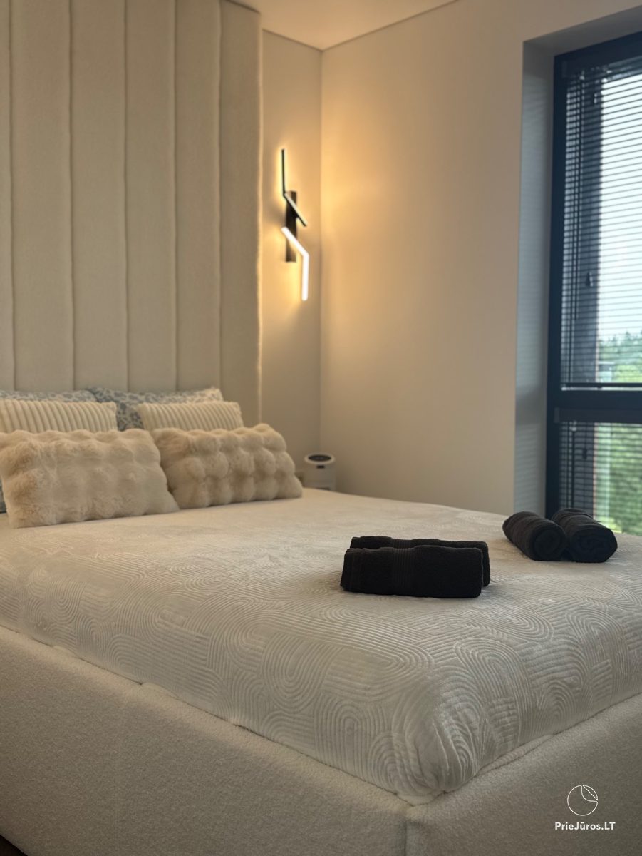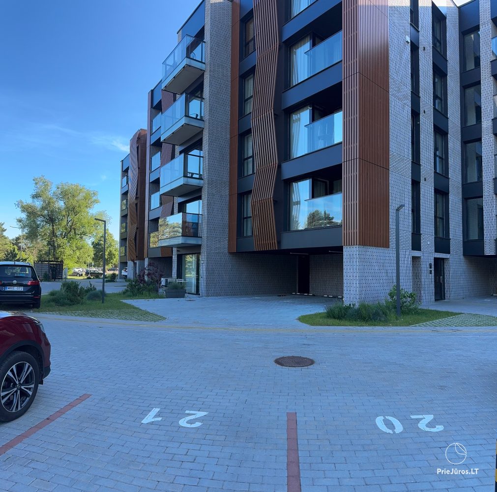 Stylish, comfortable, practical, bright - these are the words we can use to describe these brand new apartments, furnished with love, with every detail considered. Located in the Vanagupės quarter, just 600 meters from the sea on foot, along well-maintained paths through a pine forest. The apartments border Vytautas Street, and you can easily reach the city center by public transport, car, bicycle, scooter or on foot.