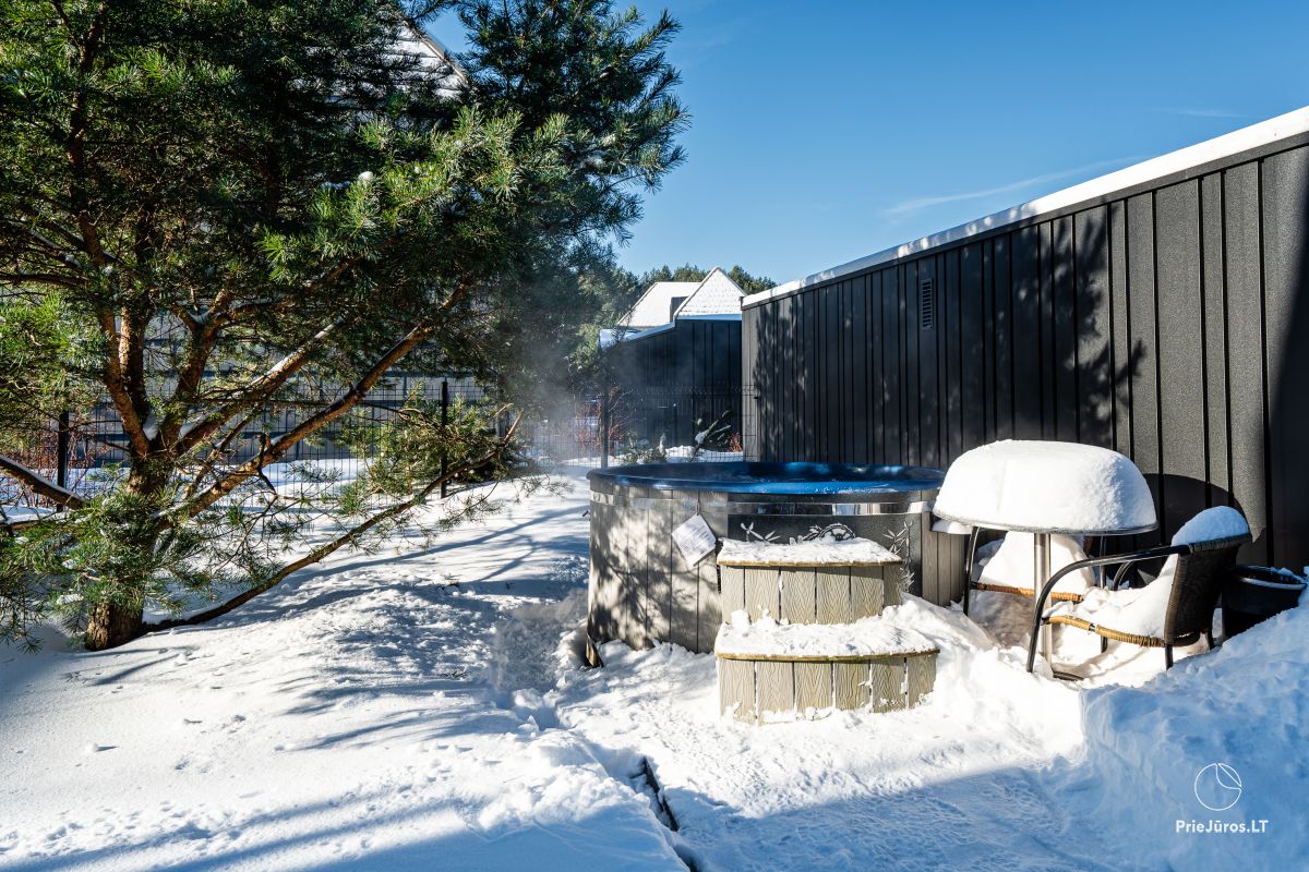 Современный коттедж "Sakalo Kopa" в Кунигишкиаи, всего в 350 метрах от моря, с большой террасой и собственным джакузи для спокойного отдыха на берегу моря. Коттедж расположен рядом с детской площадкой, имеет закрытый внутренний дворик, частную парковку, зону барбекю и станцию зарядки электромобилей и может вместить до 6 человек. Отличный выбор для семей с детьми или групп друзей, ищущих комфорт, уединение и удобное место недалеко от моря.