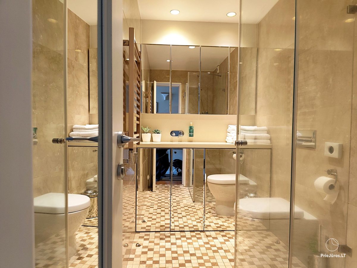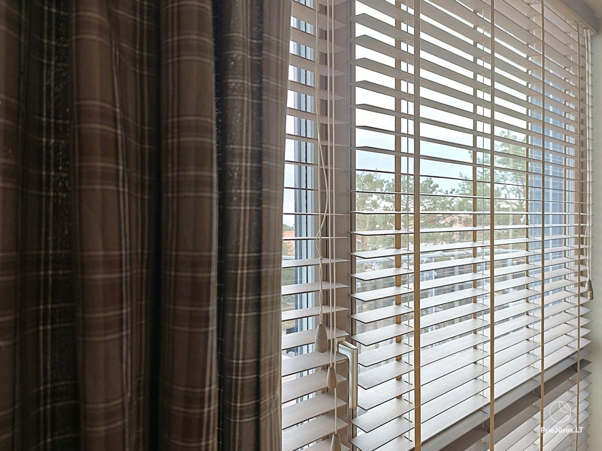 - Зелень и расположение: апартаменты расположены рядом с улицей Тайкос, ведущей к морю, а вид из окон на старые сосны создают уютную атмосферу. До набережной лагуны всего несколько минут ходьбы, а до пляжа Балтийского моря — 20 минут. (около 1,5 км) по живописной тропе,